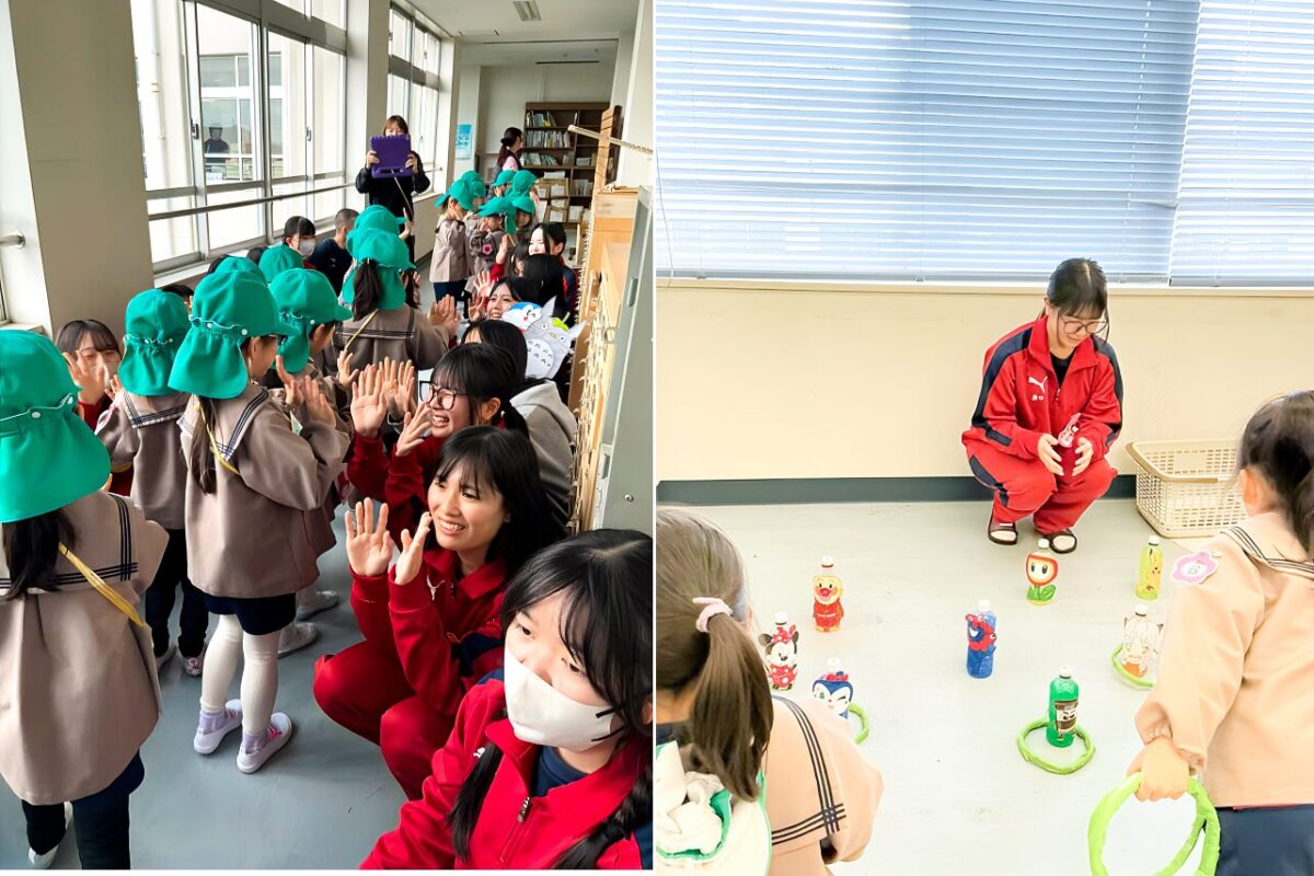 保育基礎の授業とコラボして、3年生の選択者が小さなお客さまのお相手をさせていただきました。